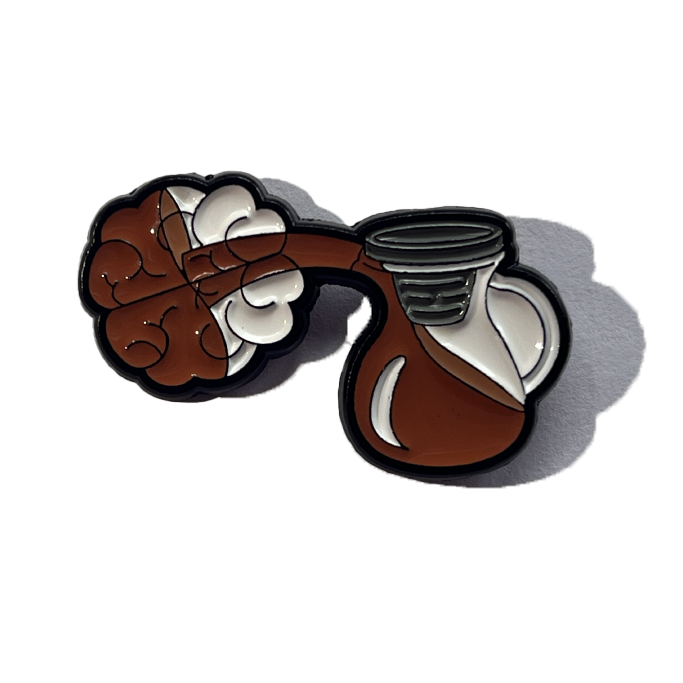 El pin de "Filling the brain with coffee" es un accesorio distintivo que simboliza la conexión entre la creatividad y la cafeína. Ideal para entusiastas del café y la cultura creativa, este pin es un recordatorio visual de cómo el café puede estimular la concentración y la productividad, elementos fundamentales en actividades intelectuales.