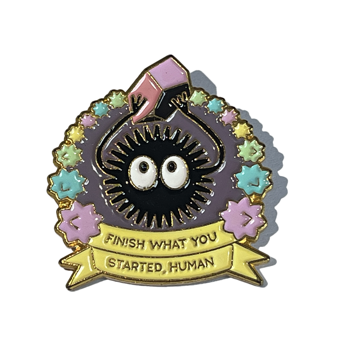 ¡Completa lo que comenzaste, ser humano! Lleva siempre contigo este divertido pin con el mensaje "Completa lo que empezaste humano" y el encantador espíritu de la película de animación "El viaje de Chihiro". No dejes que nada te detenga en tus logros y objetivos. ¡Adquiere ya tu pin y sigue adelante en tu viaje!