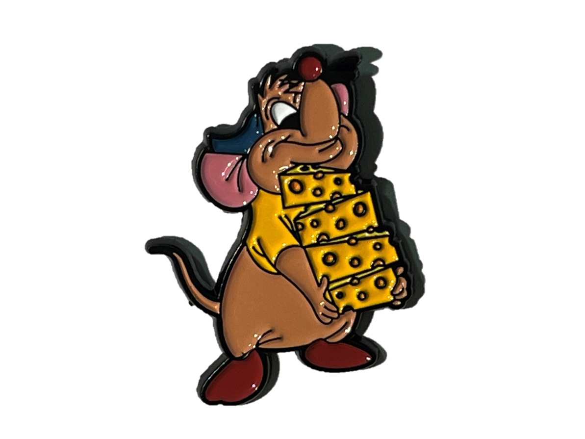 Este pin captura toda la ternura del pequeño ratón, con sus cachetes redondeados y su expresión de pura alegría mientras se las ingenia para equilibrar esa enorme pila de quesos. 🧀🐭