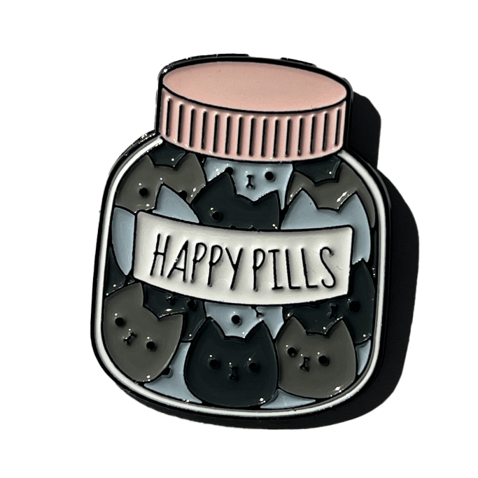 Con este adorable pin de Happy Pills, puedes llevar contigo una adorable jarra llena de gatos felices. ¡Un accesorio divertido y encantador para cualquier amante de los gatos!