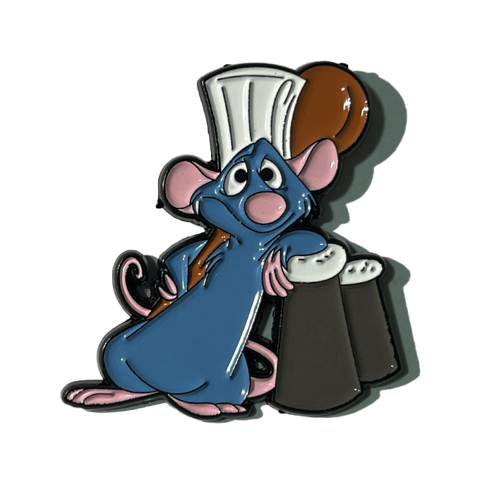 Remy en forma de pin, con diseño inspirado en Ratatouille. Una forma única de demostrar tu amor por esta adorable rata y su deliciosa aventura culinaria. ¡Agrega un toque de encanto a tu atuendo con este accesorio perfecto para fanáticos de la película!