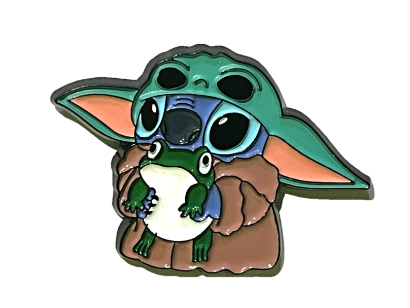 El pin presenta a Stitch vestido de Grogu, combinando la ternura de Baby Yoda con el toque travieso y cómico de Stitch.