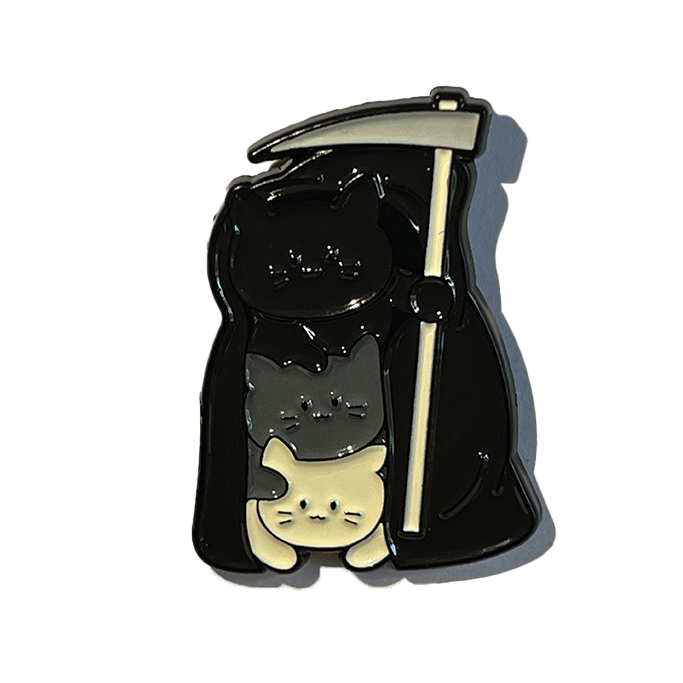 Tres gatos disfrazados como La Muerte en un pin. ! Perfecto para los amantes de los gatos y el humor negro. Muestra tu estilo irreverente con este accesorio único. (¡No es para los supersticiosos!)
